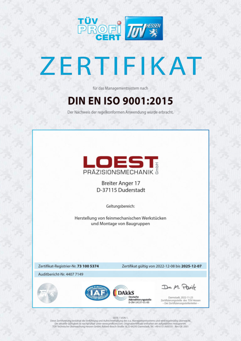Unsere Qualität stellen wir durch ein etabliertes und zertifiziertes Qualitätsmanagementsystem nach ISO EN DIN 9001:2015 sicher. Ergänzt wird dies durch moderne Mess- und Prüftechnik, klar definierte Prozesse sowie kontinuierliche Kontrollen während des gesamten Fertigungsablaufs. So gewährleisten wir eine gleichbleibend hohe Qualität und maximale Präzision unserer Bauteile.